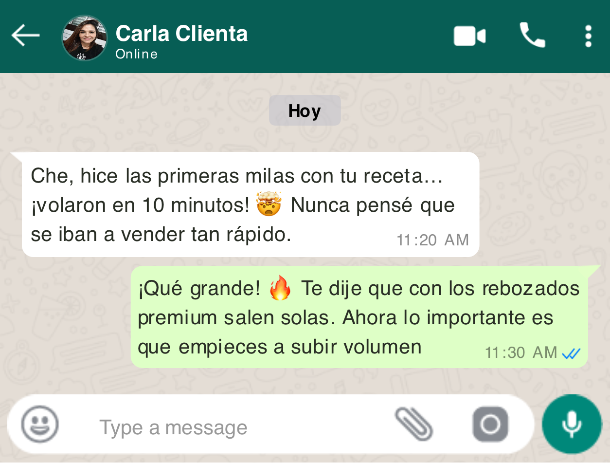 Vas a tener +100 recetas únicas, una tabla automática de precios, ideas de combos, tips de venta por WhatsApp y redes…